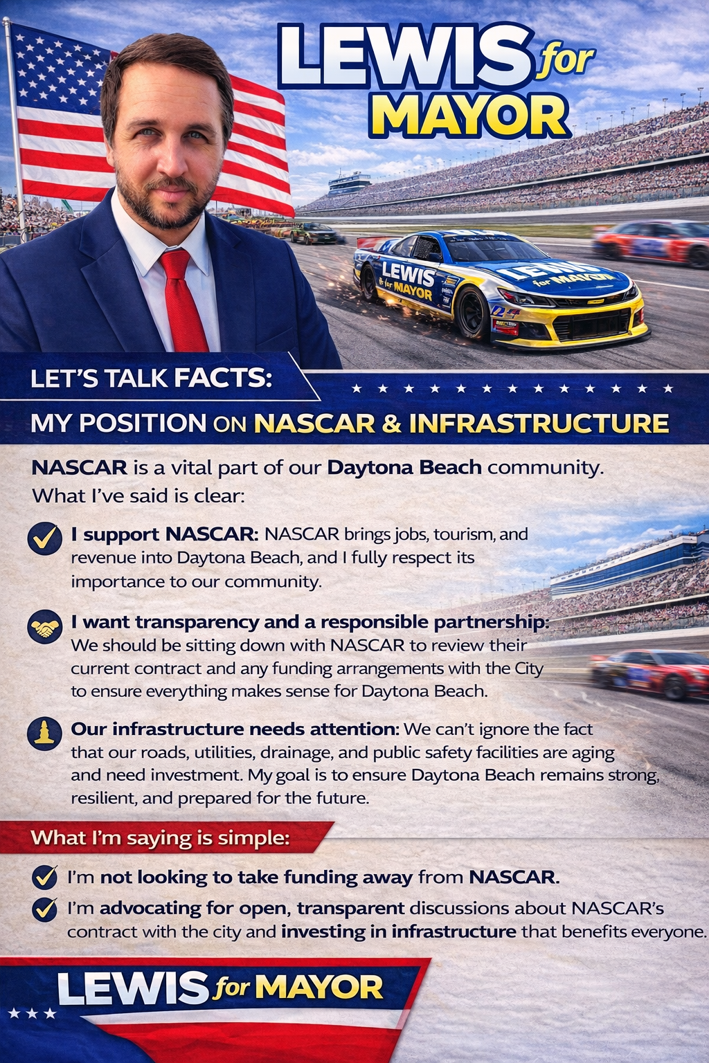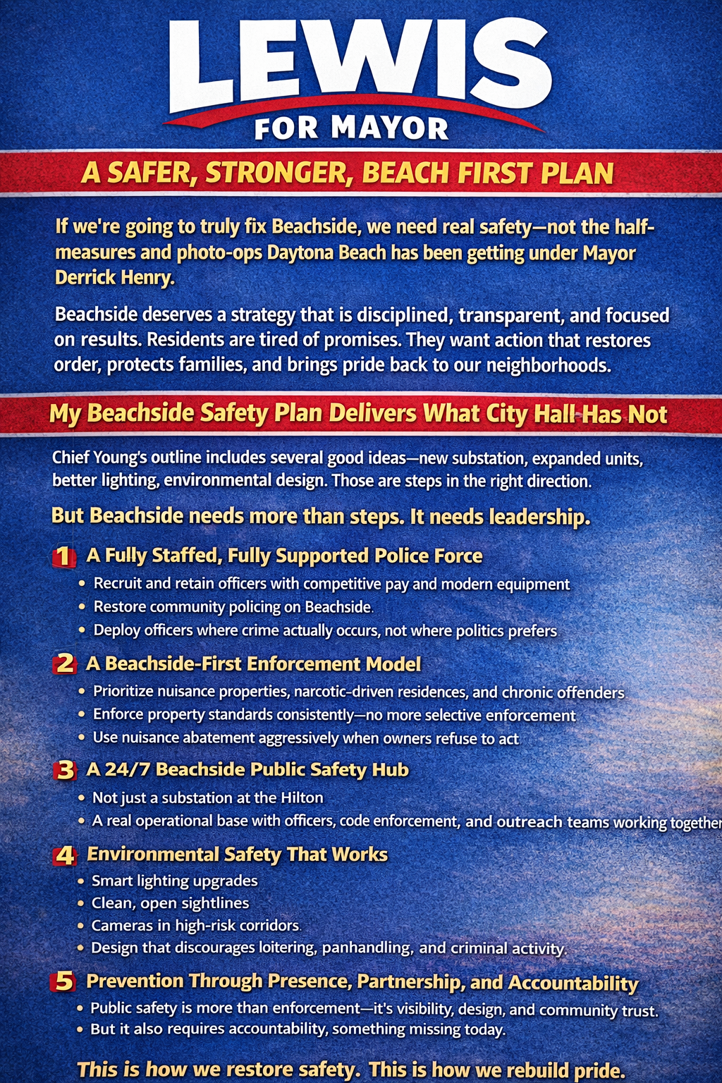 Dr. Lewis’s campaign centers on the belief that Daytona Beach deserves a mayor who listens first, acts decisively, and leads with both strength and compassion. His run represents not just a bid for office, but a call for unity, civic pride, and a shared vision for a stronger, safer, and more prosperous Daytona Beach.